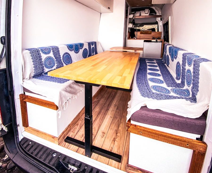 It has a bathroom and shower inside. With a 100 liter water tank and 2 meter queen size bed. The gas kitchen is fully equipped and has a space with a table so you can work or relax comfortably.